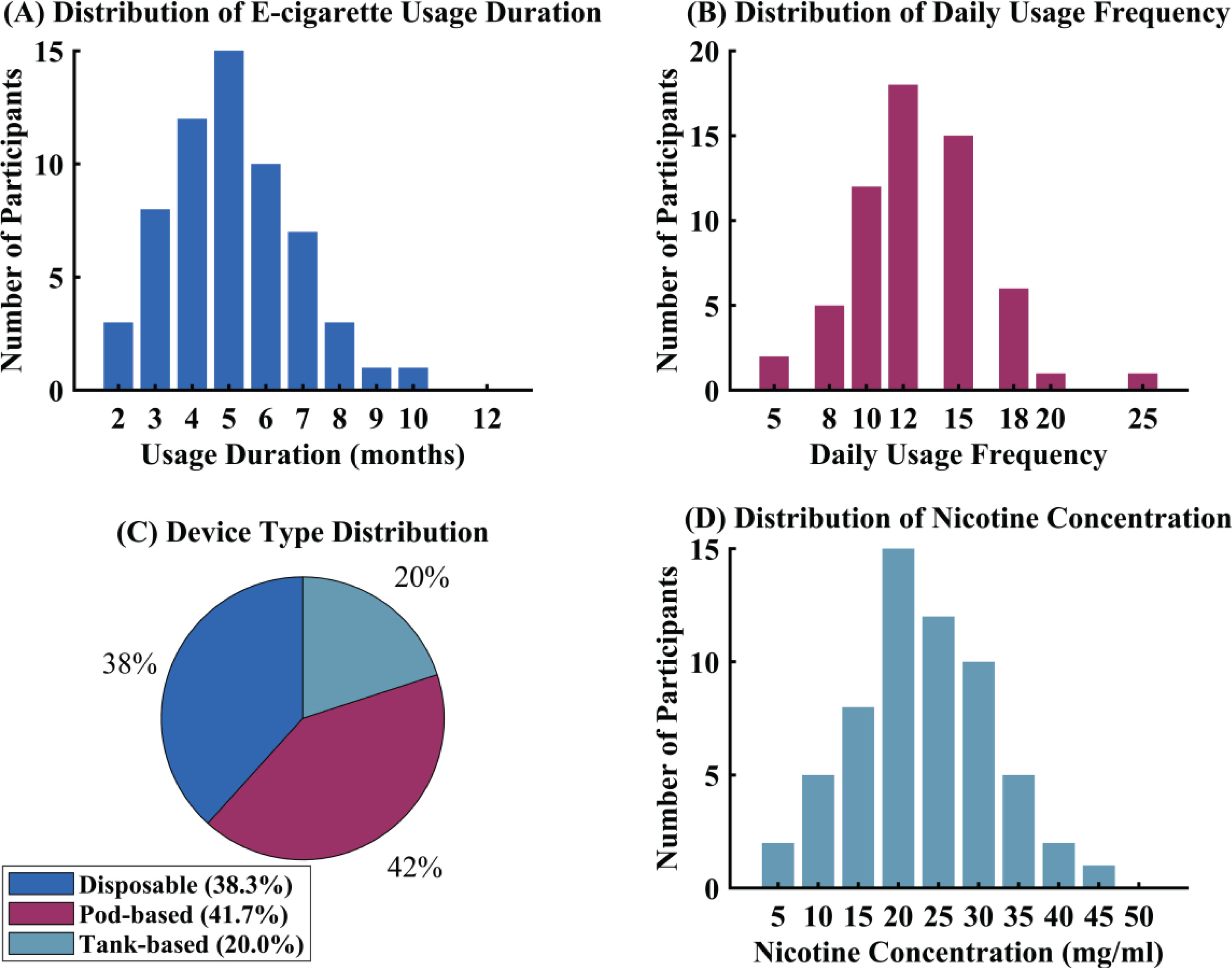 Detailed characterization of e-cigarette usage patterns within the exposure group revealed specific consumption behaviors and device preferences, as illustrated in Figure 2. The median duration of e-cigarette use was 5.5 months, indicating relatively recent initiation among this young adult population. Usage frequency per day averaged 12.5 episodes, demonstrating regular consumption patterns among users. Device type preferences showed that 38% of participants utilized disposable e-cigarette systems, while the remaining participants favored refillable pod-based or tank-based devices. Nicotine concentration analysis revealed an average content of 20 mg/mL across consumed products. Flavor preferences were distributed across fruit, menthol, and dessert categories, with fruit flavors being most commonly selected. These usage characteristics are described in Figure 2.