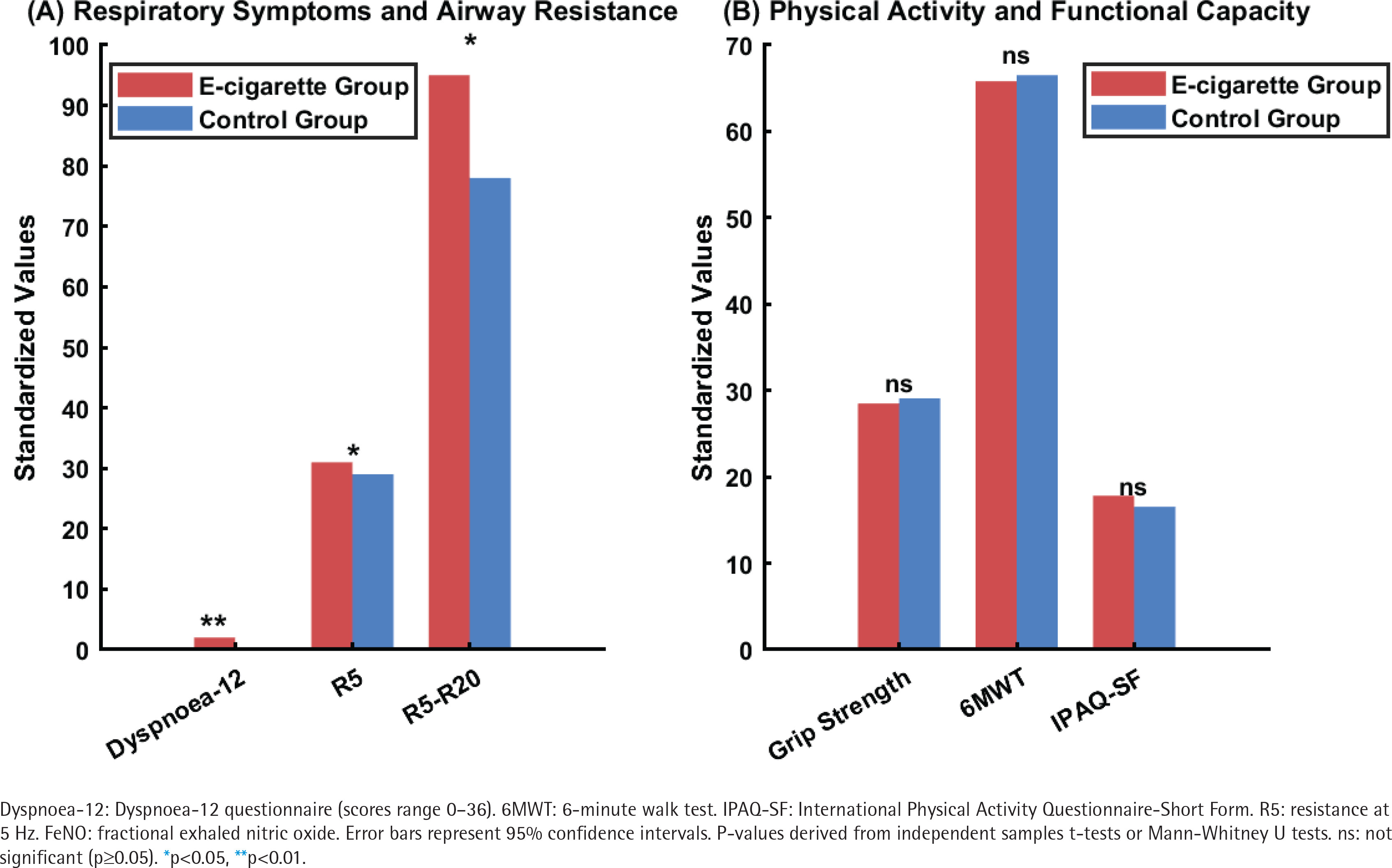 The primary outcome was respiratory symptom severity assessed by Dyspnoea-12 total score. Secondary outcomes included impulse oscillometry parameters (R5; R5-R20), spirometric measures (FEV1, FVC, FEV1/FVC, FEF25-75), FeNO levels, and physical activity measures. Given the exploratory nature of this study with pre-specified hypotheses for each outcome, no corrections for multiple comparisons were applied, and results should be interpreted with appropriate caution. Sensitivity analyses were conducted to verify the robustness of primary findings, including robustness testing through exclusion of potential outliers (defined as Dyspnoea-12 scores exceeding the 95th percentile) and non-parametric verification using Mann-Whitney U testing. All statistical tests were two-tailed.