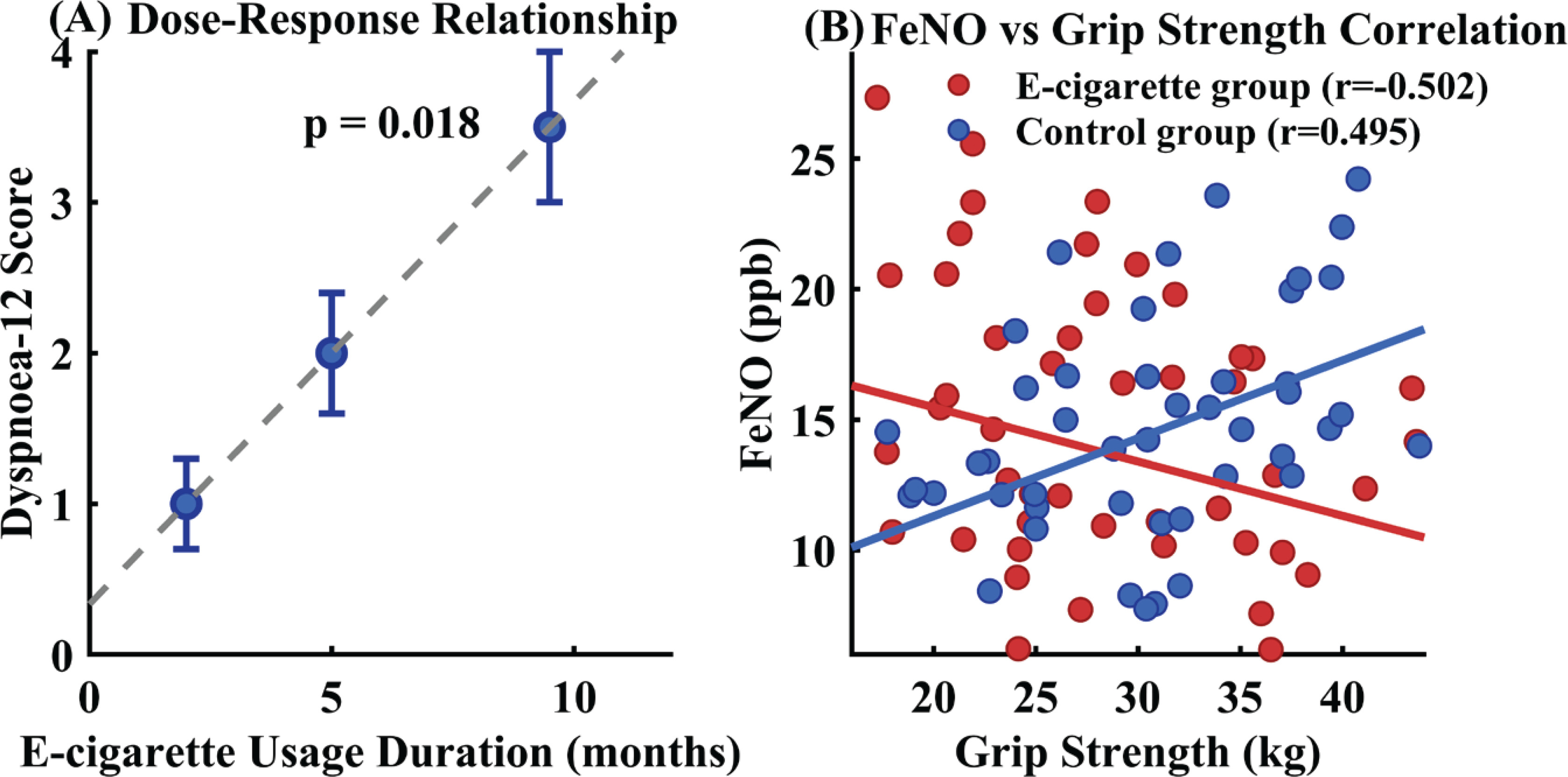 This cross-sectional investigation provides evidence that e-cigarette use among university students is associated with elevated respiratory symptoms and subtle alterations in pulmonary mechanics, even in the absence of conventional spirometric abnormalities. The observed dose-response relationship between usage duration and Dyspnoea-12 scores, coupled with increased peripheral airway resistance detected through impulse oscillometry, suggests that e-cigarette exposure may induce early respiratory changes that precede detectable lung function impairment20. The finding that respiratory symptom severity correlates with exposure duration aligns with emerging longitudinal evidence from Stevens et al.14 and Chaiton et al.21, which demonstrated progressive respiratory health deterioration and associations between e-cigarette use and functionally important respiratory symptoms among young users. The disrupted physiological associations between FeNO and muscular function observed in e-cigarette users represent a novel finding that warrants further investigation, potentially indicating systemic alterations in nitric oxide metabolism pathways.