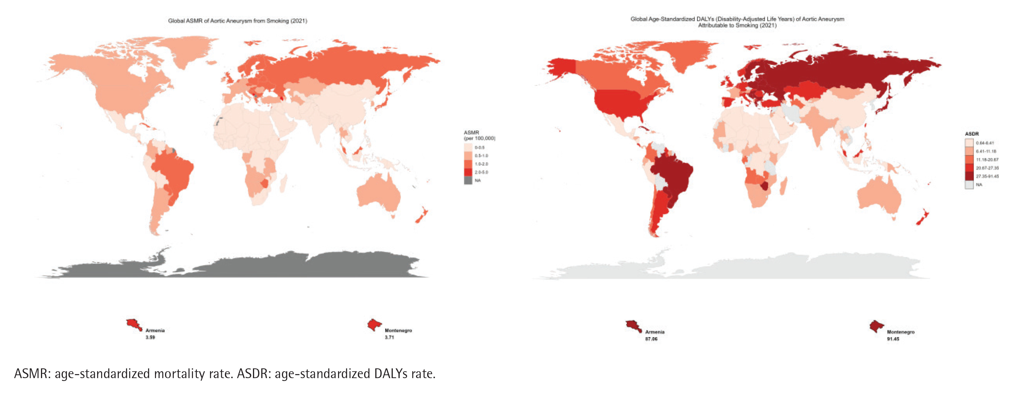 Smoking-related AA deaths increased in 180 countries worldwide during the study period, with ASMR rising in 76 countries. The absolute number of smoking-related AA deaths was highest in Japan, China, and the United States in 2021 (Supplementary file Table S1), but the countries with the highest ASMR were Armenia (3.59) and Montenegro (3.71); ASDR trends were similar to ASMR, and the highest countries were Armenia (87.06) and Montenegro (91.45) (Figure 2).