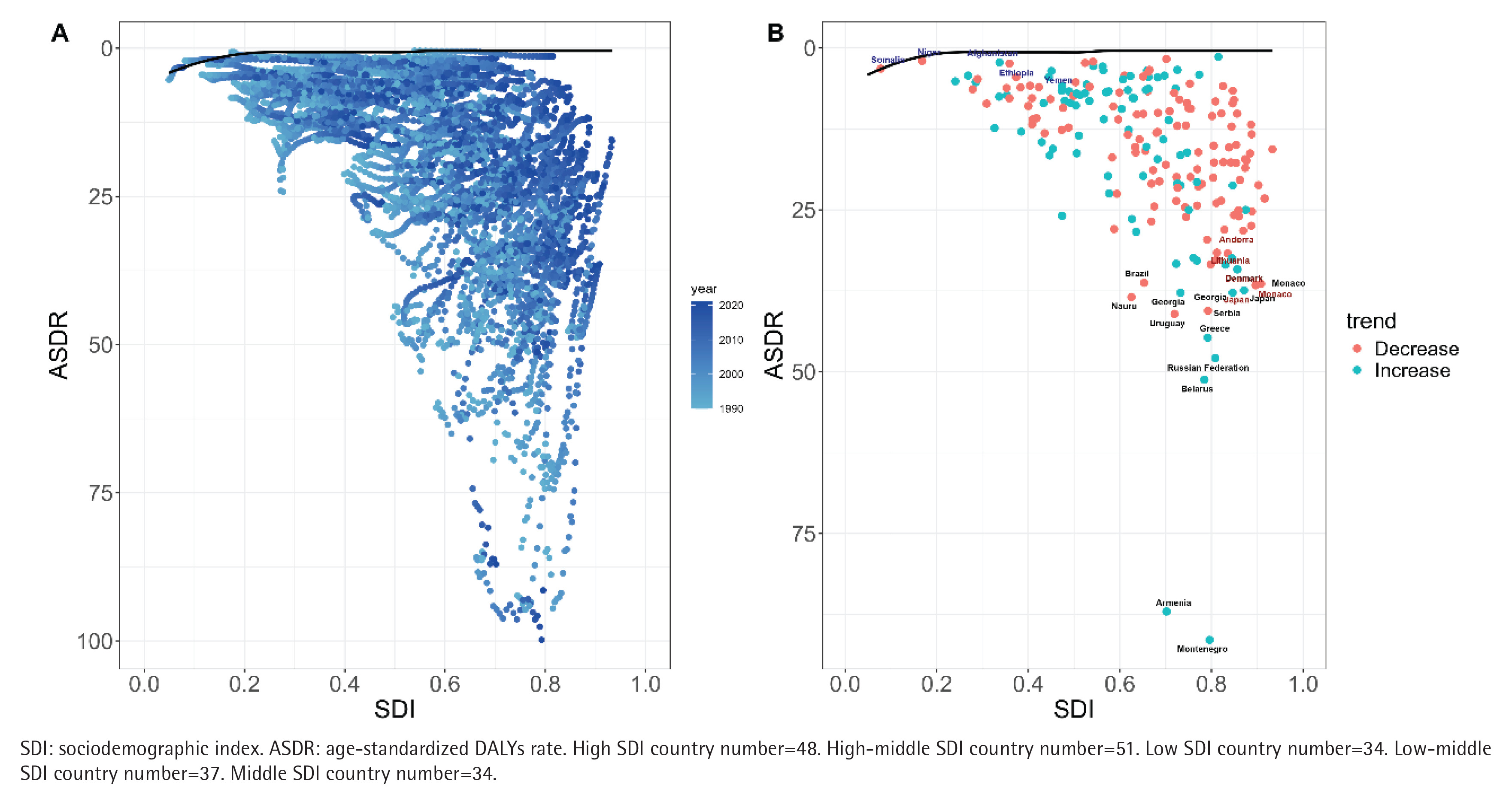 Sociodemographic index (SDI), as a comprehensive development indicator, is closely related to health outcomes. The index consists of geometric means of three key components, each standardized on a scale of 0 to 1: female fertility below 25 years of age, average years of education of the population aged ≥15 years, and lagged adjusted per capital income. In the GBD 2021 analysis, SDI scores are shown on an adjusted scale (i.e. raw index multiplied by 100). Thus, a score of 0 represents the lowest level of development, while a score of 100 represents the highest level of development. According to their SDI values, the 204 countries and regions covered in the study were divided into five groups: low, low-middle, middle, high-middle, and high. This classification helps to understand the relationship between development and health in different regions13.