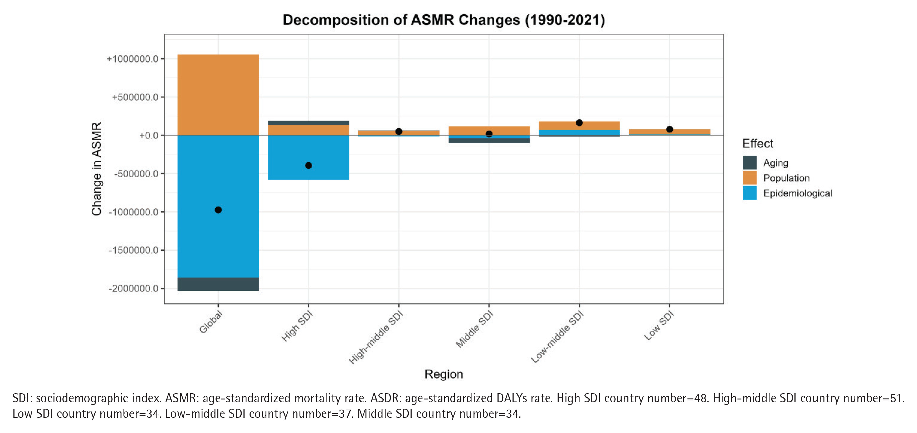 This study provides a comprehensive analysis of the global burden of smoking-related AA, leveraging the robust and standardized methodology of the GBD study. Our findings, based on data from 1990 to 2021, reveal that despite an overall increase in the absolute number of deaths, the ASMR and ASDR attributable to smoking showed a significant declining trend. This overall improvement was primarily driven by favorable changes in epidemiological trends, as indicated by our decomposition analysis.