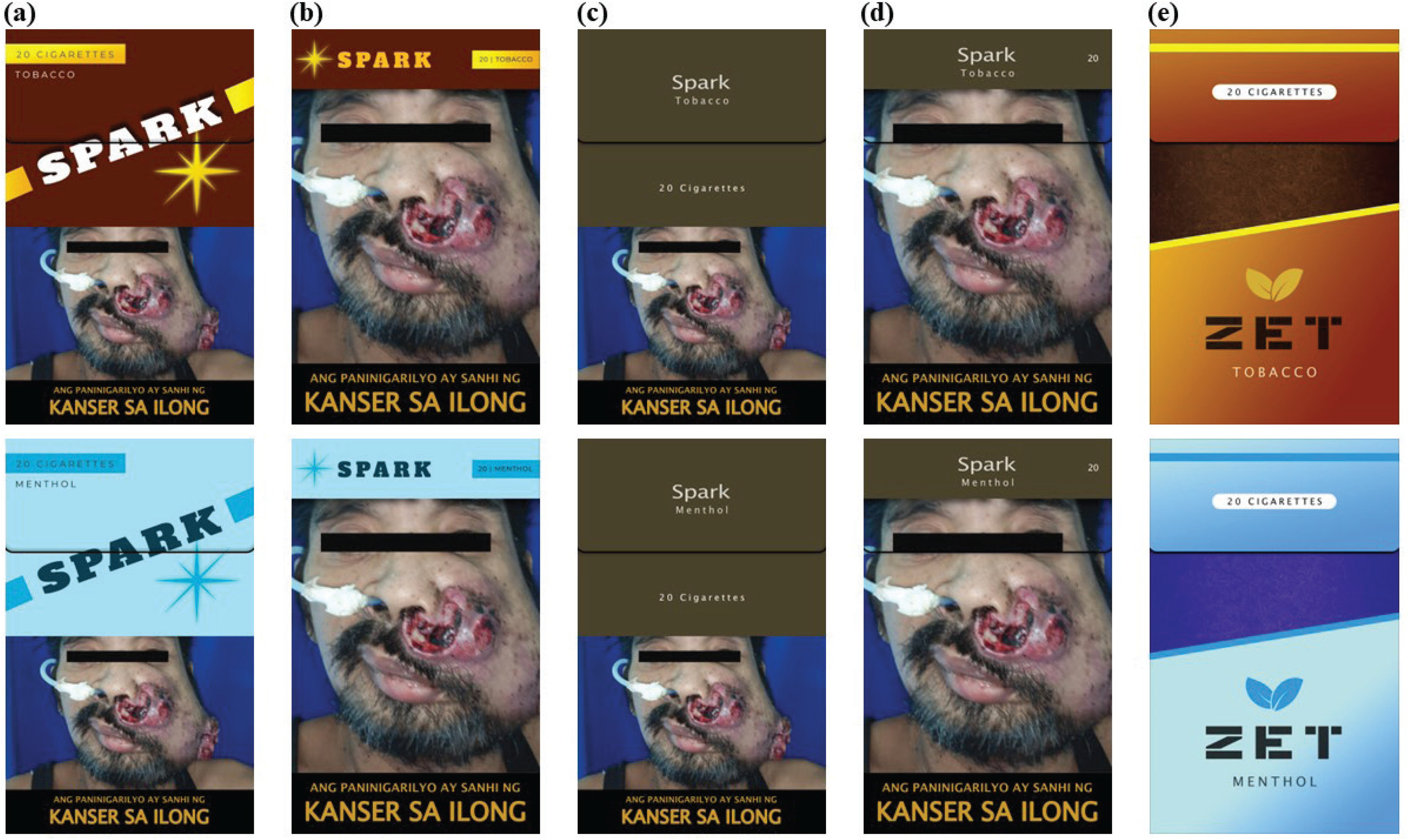 We created two cigarette brands for the study stimuli to reduce any bias associated with an existing brand. The two created brands – Spark and Zet – were based on cigarette brands already sold in the Philippines. Spark was meant to represent ‘domestic’ cigarettes for sale in the country, while Zet was meant to represent a ‘foreign’ brand. For all Spark packs, we varied the excise tax added to the pack price, the branding and graphic HWL coverage, and flavor. For the Zet pack, we only varied the price and pack flavor; the pack was branded without an HWL to reflect packs that may be illicitly available for sale under any policy change condition.