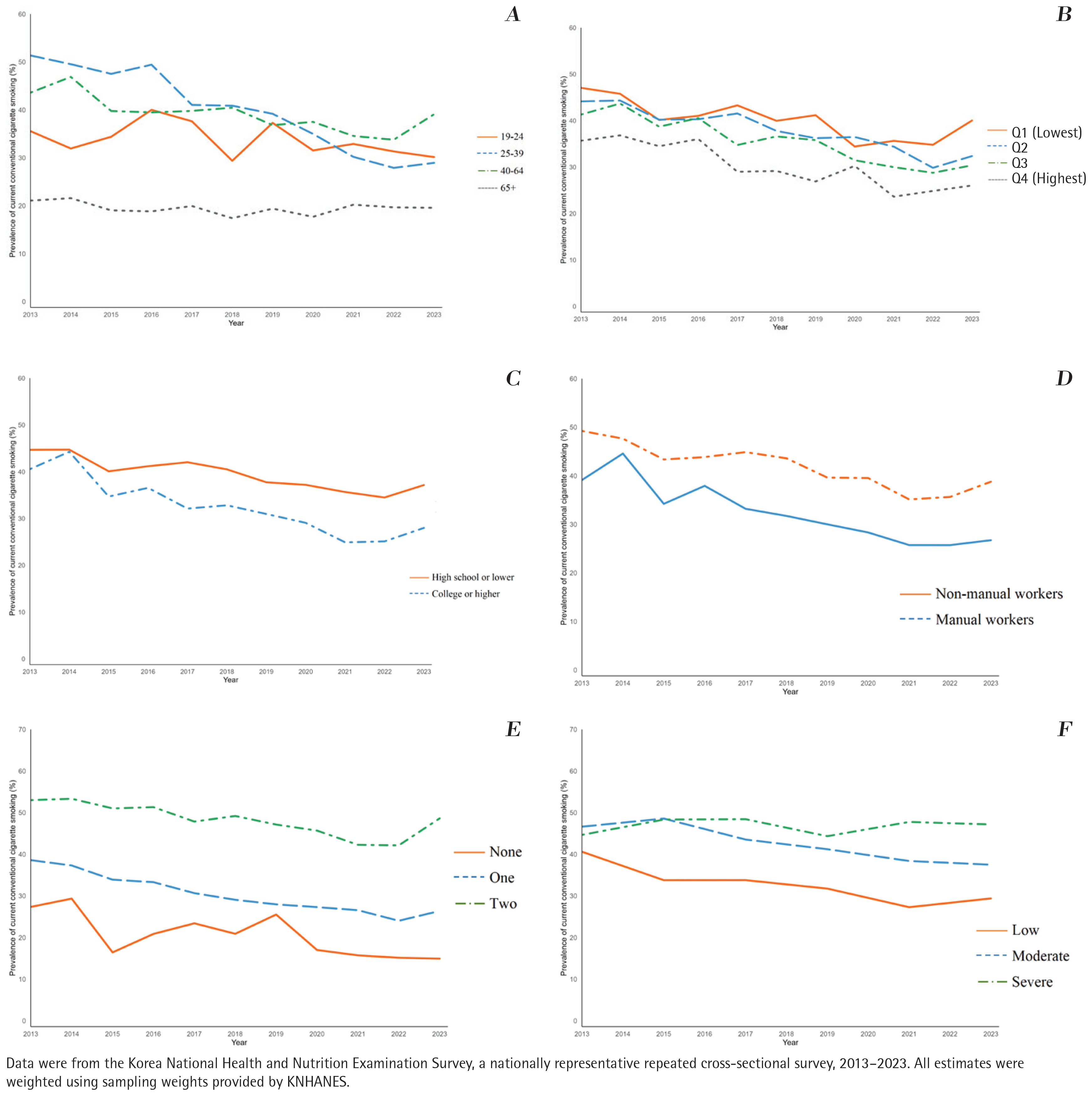 The growing availability of electronic cigarettes (ECs) and heated tobacco products (HTPs) increases combined use of conventional cigarettes (CCs) with EC or HTPs (hereafter, poly-tobacco use) and appears to impede further declines in CC smoking prevalence5,6. The rapid proliferation of novel tobacco products, such as ECs and HTPs has complicated the tobacco use landscape in Korea. Following the introduction of HTPs in Korea in 2017, sales of ECs and HTPs have increased by 8.3 times, from 78.7 million to 655.9 million packs7. These shifts in the tobacco market underscore the need for a robust understanding of how tobacco use patterns have evolved over time in South Korea, and the extent to which these patterns have been equally distributed across the population.