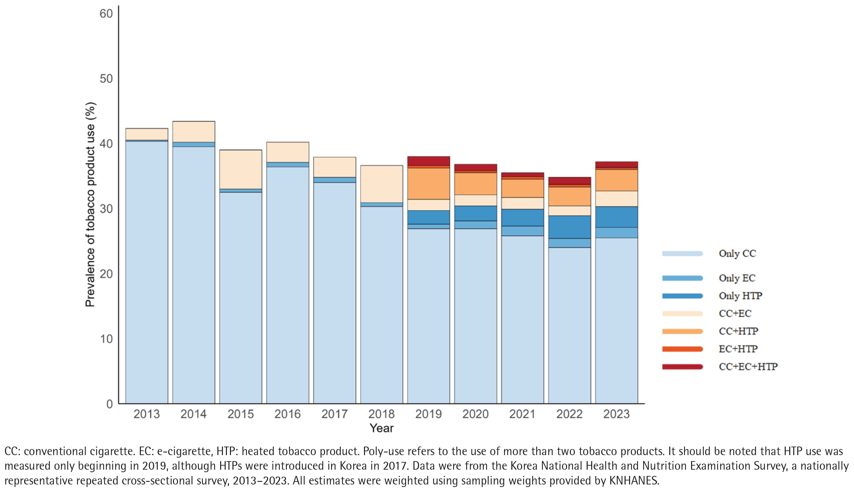 Despite the limitations, this study provides robust and timely evidence on ten-year trends in tobacco use within key subgroups, reflecting the evolving tobacco landscape in Korea. A strength of this study is the assessment of within-subgroup trends over an extensive ten-year period across different types of tobacco use (CCs, ECs, HTPs, and poly-tobacco use) using nationally representative data.
