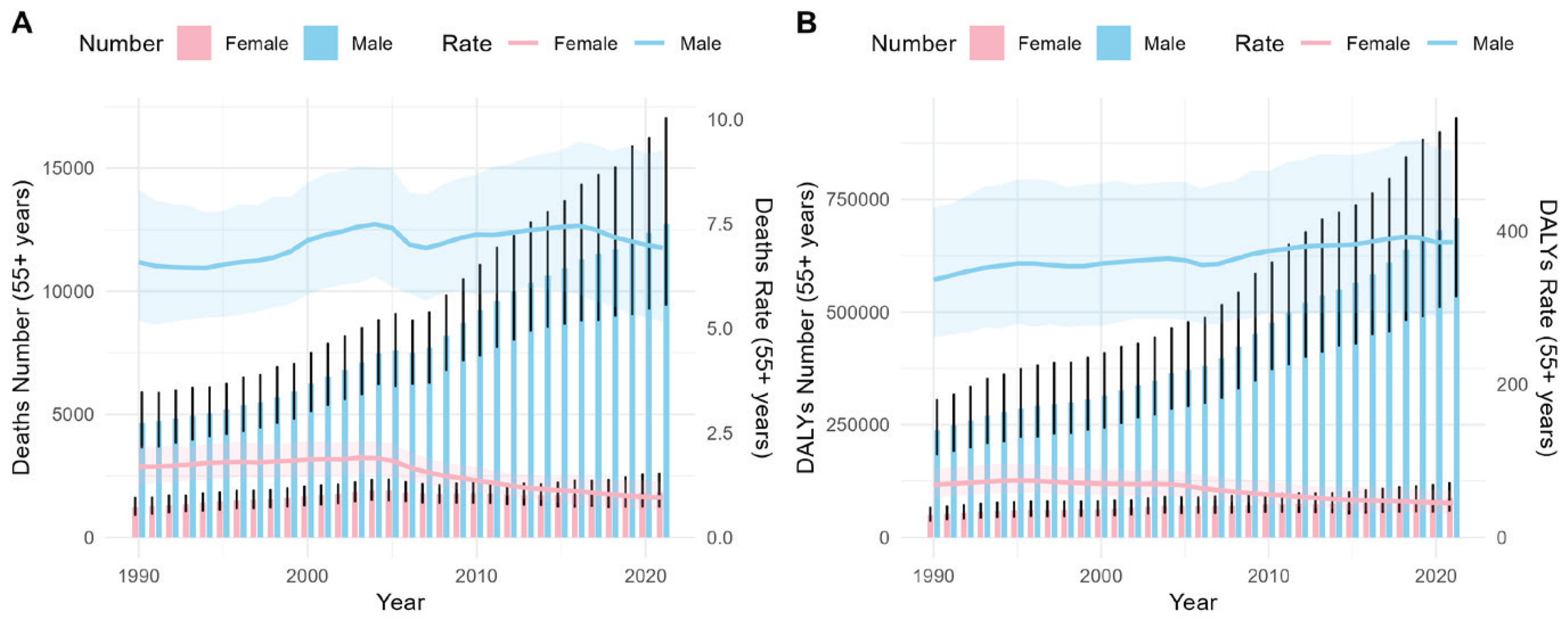 Comparing data from 1990 and 2021, the age group with the highest number of deaths shifted from 65–69 to 70–74 years. The age group of 80–84 years exhibited the most substantial increase in the EAPC, whereas the 60–64 years age group showed the most significant decline. Notably, the age group ≥95 years experienced the highest relative increase in deaths, while the age group of 55–59 years demonstrated the most pronounced relative decrease in mortality rates. For DALYs, the trends in both the number and rate changes remained similar between the two years, with the age group of ≥95 years having the highest EAPC and the age group of 75–79 years showing the most notable rate increase.