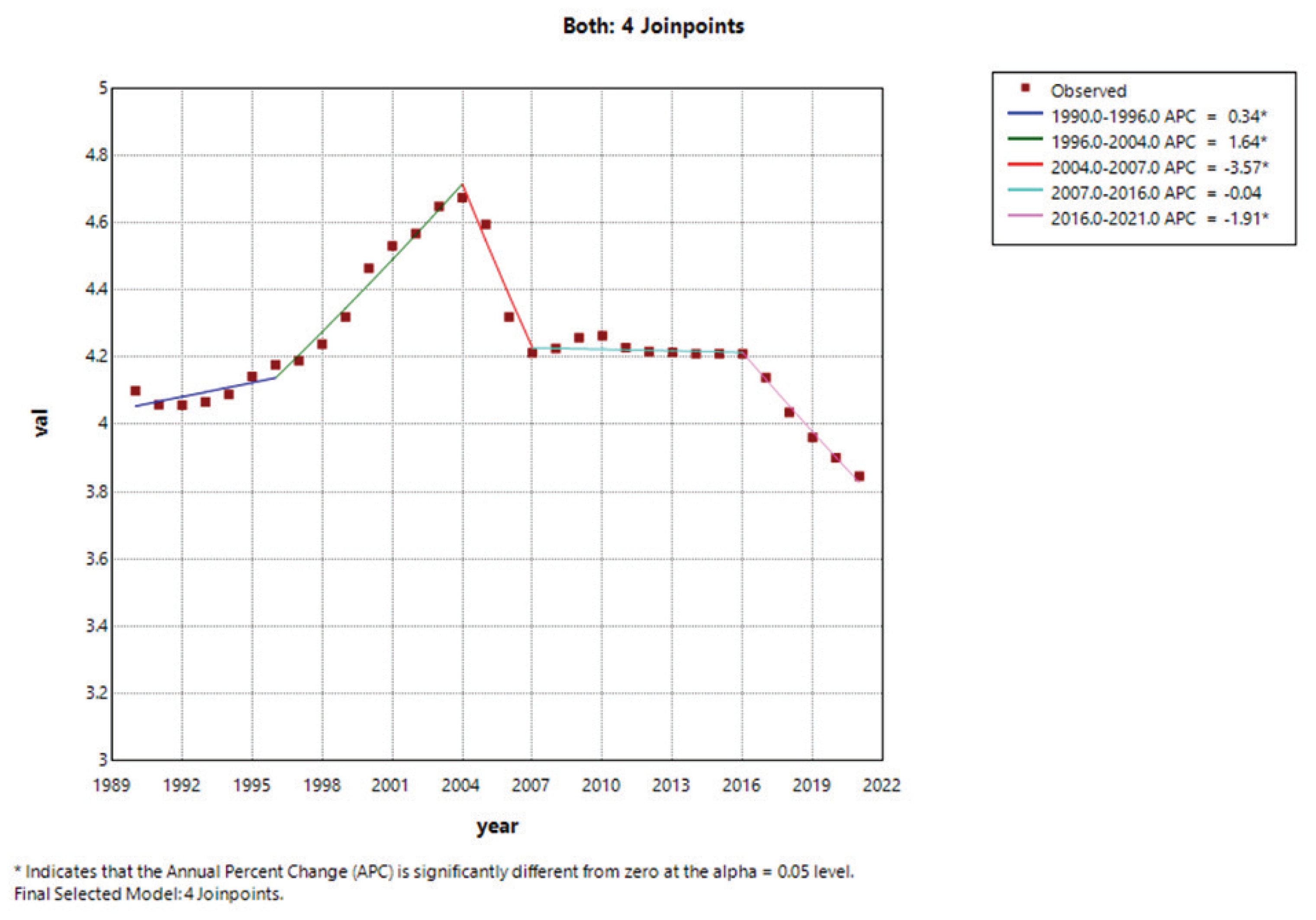 The joinpoint analysis revealed that the overall (both sexes, Figure 3) AAPC from 1990 to 2021 was -0.19 (95% CI: -0.37 – -0.00), indicating that the mortality burden of smoking among middle-aged and elderly patients with T2DM aged ≥55 years did not show a statistically significant changing trend. This trend was divided into five distinct phases: 1990–1996 (APC=0.34; 95% CI: 0.04–0.64), 1996–2004 (APC=1.64; 95% CI: 1.42–1.87), 2004–2007 (APC= -3.57; 95% CI: -5.10 – -2.01), 2007–2016 (APC= -0.04; 95% CI: -0.22–0.15), and 2016–2021 (APC= -1.91; 95% CI: -2.41– -1.40). Except for the period of 2007–2016, all phases showed significant trends (p<0.05). The temporal pattern in males was generally consistent with the overall trend, while females exhibited a trend of first increasing and then decreasing (Supplementary file Tables S1 and S2, Figures S1A–S1C).