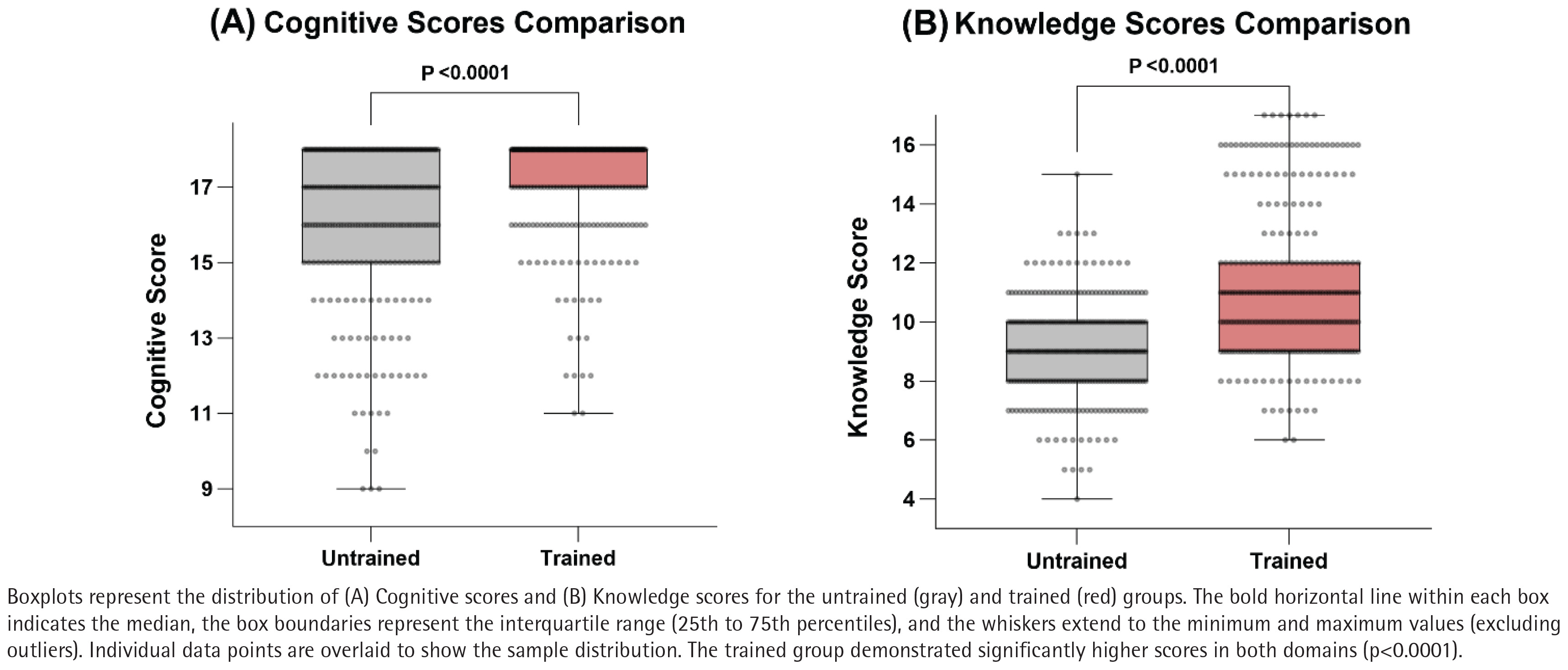 As illustrated in Figure 1B, the overall knowledge scores were significantly higher in the trained group compared to the untrained group (p<0.001). Specifically, the trained group achieved significantly higher correct response rates for most single-choice and multiple-choice questions (Table 3). For instance, in Single-Choice 1 (harms of tobacco), the correct rate was 30.0% in the trained group versus 12.6% in the untrained group (p<0.001). In Multiple-Choice 5 (behavioral replacement therapies), the correct rate was 75.2% versus 59.3% (p<0.001). However, no significant differences were observed for Single-Choice 3 and Multiple-Choice 2 (p>0.05). Notably, for Multiple-Choice 7 (5As intervention), while the trained group performed significantly better (p<0.001), the absolute correct rates were low in both groups (11.5% vs 1.1%).